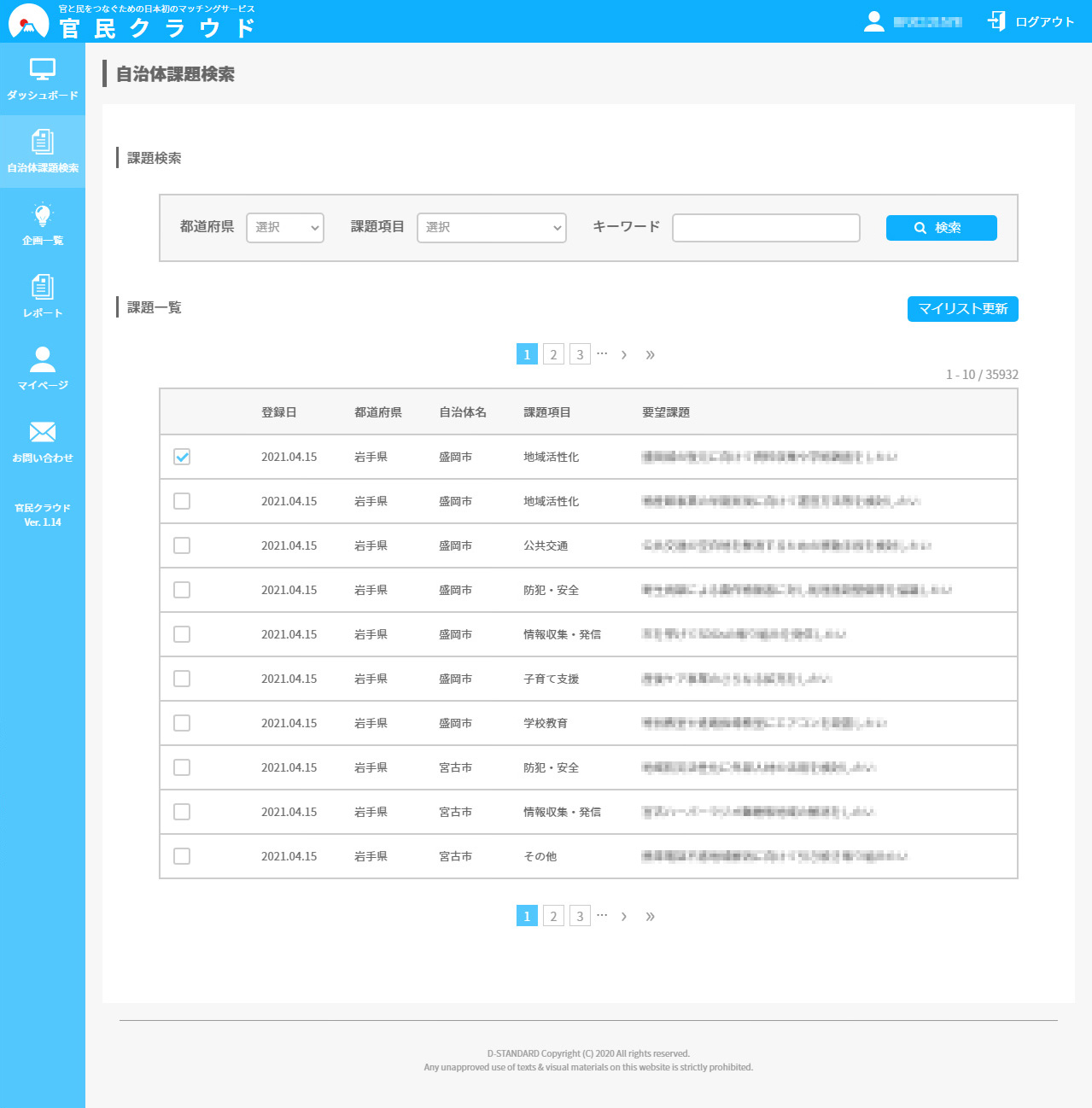 - 検索機能の復旧について会員(自治体・民間)向け自治体課題一覧ページの表示及び検索機能の一部の不具合について復旧致しました。再発防止に努めてまいりますので今後とも宜しくお願い申し上げます。
